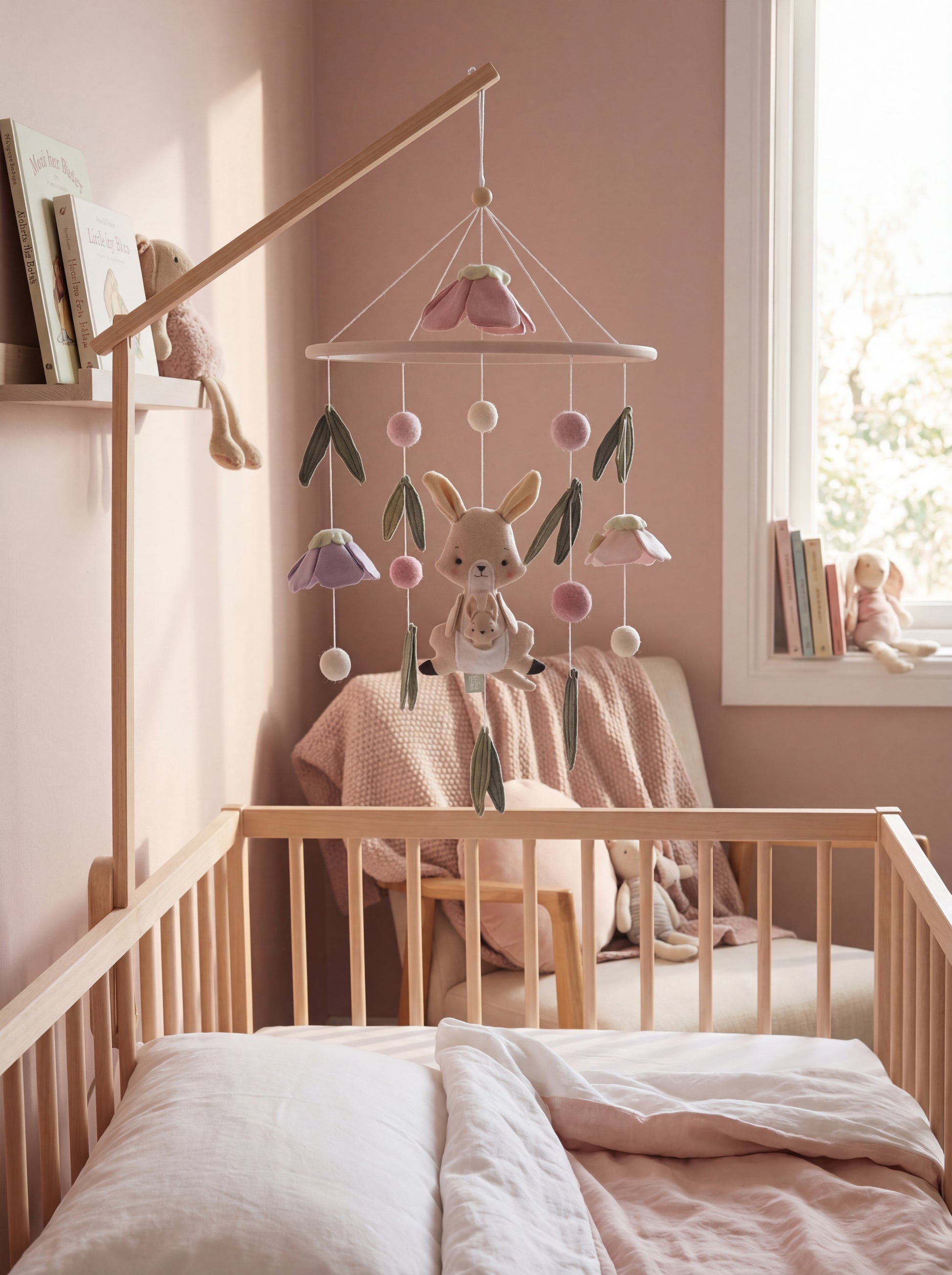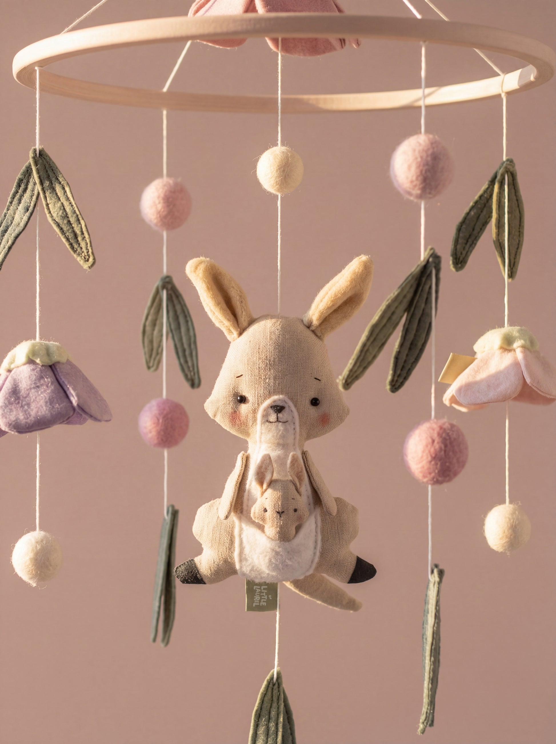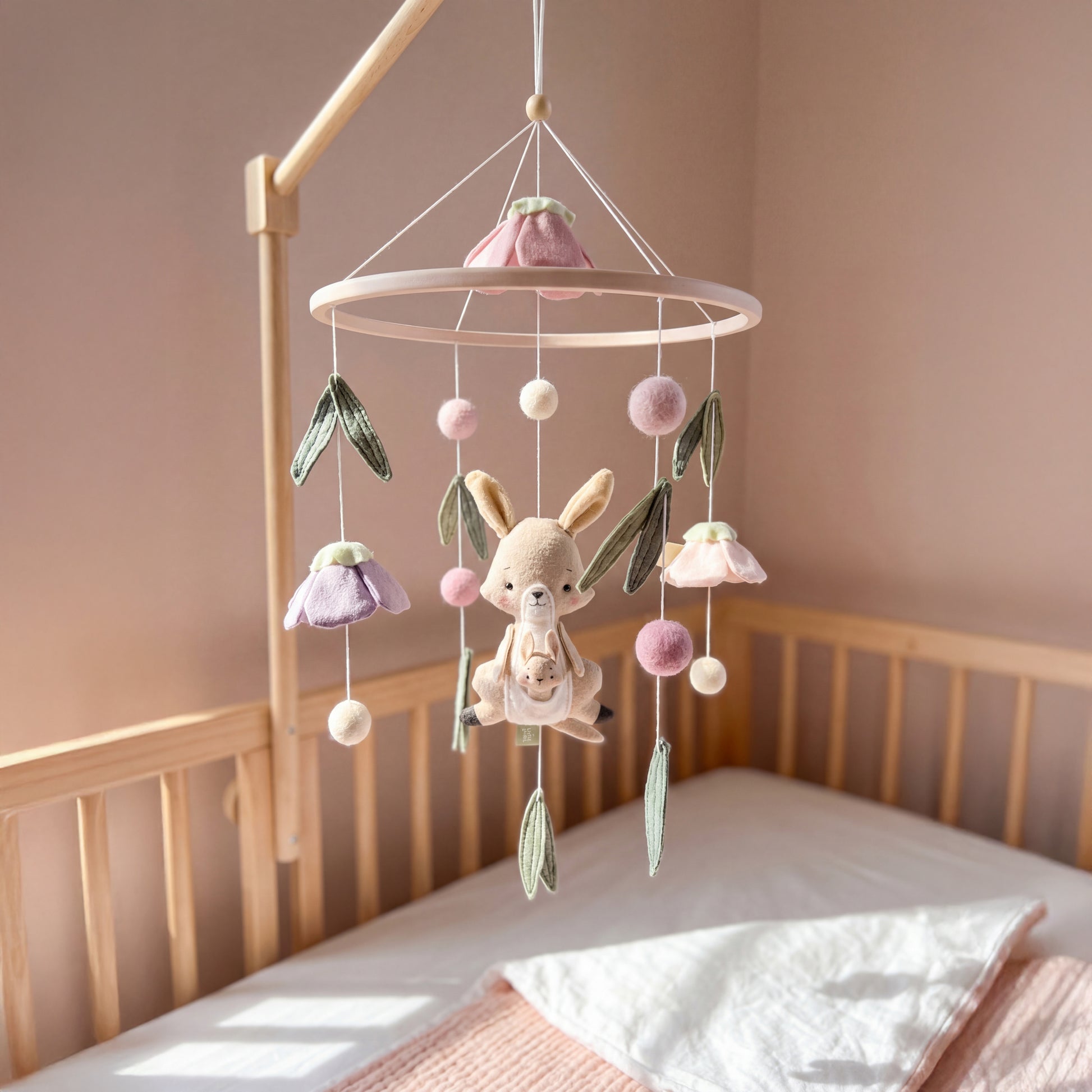 Bring a touch of Australia to your little one’s nursery with our handcrafted Kangaroo Meadow Wonders Mobile. A charming keepsake, it’s designed to soothe your baby and spark their imagination from day one. Each mama kangaroo and joey, along with eucalyptus leaves, is made from soft, lightweight fabrics in calming colours, gently spinning to support visual curiosity. A high-quality, Australiana-themed nursery décor piece, our mobile makes a thoughtful baby shower gift or a lovely centerpiece for any little one’s space.